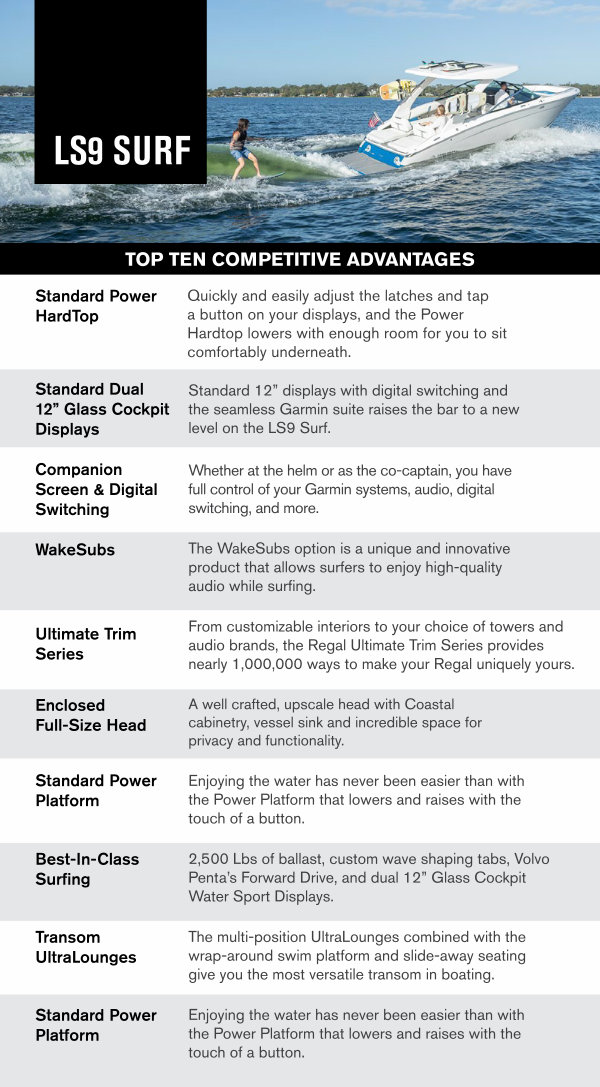 2,500 Lbs of ballast, custom wave shaping tabs, Volvo Penta’ s Forward Drive, and dual 12” Glass Cockpit Water Sport Displays.