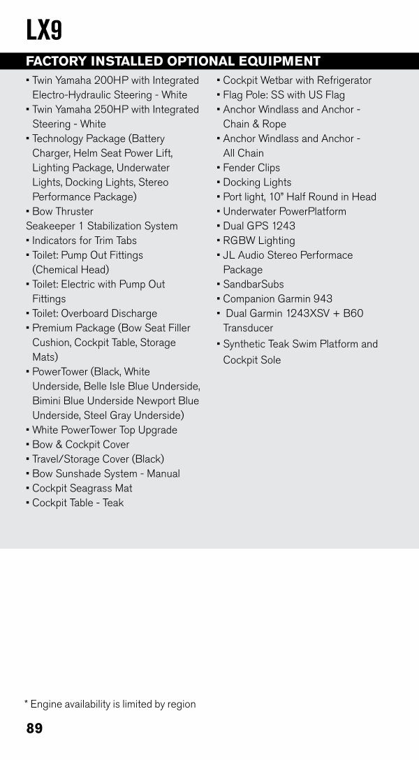 • Technology Package( Battery Charger, Helm Seat Power Lift, Lighting Package, Underwater Lights, Docking Lights, Stereo Performance Package)