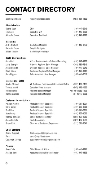 Finance Sean Cuda Jessica Dahl dealersupport @ regalboats. com parts @ regalboats. com customer. service @ regalboats. com