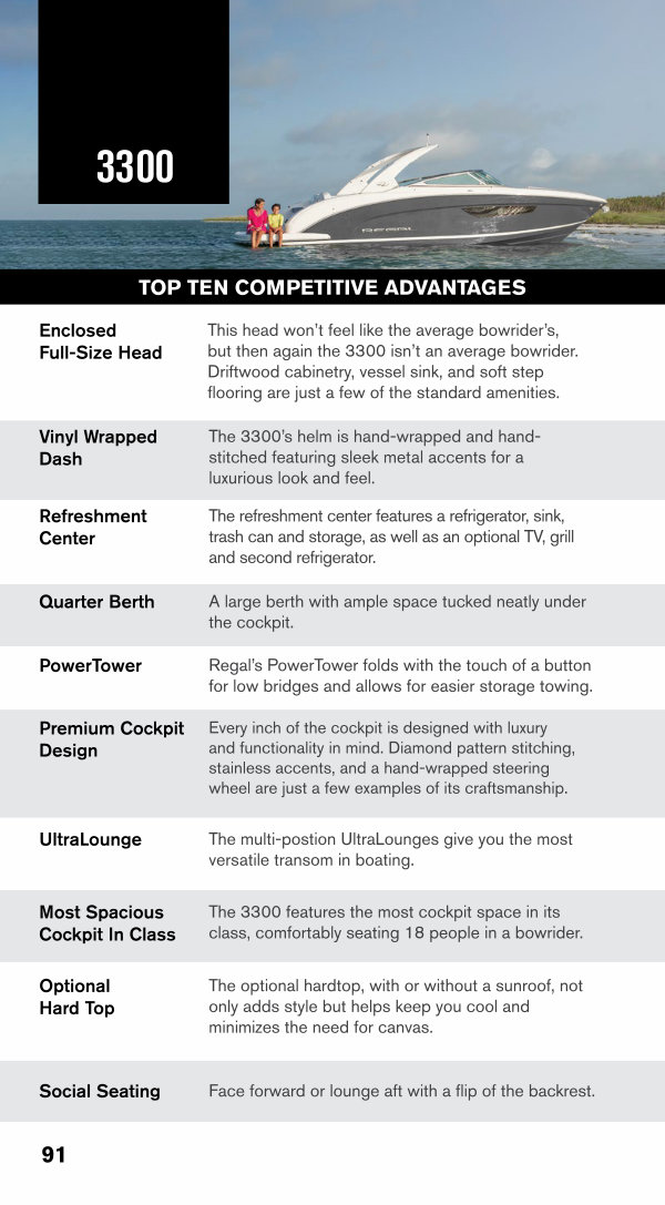 This head won’ t feel like the average bowrider’ s, but then again the 3300 isn’ t an average bowrider. Driftwood cabinetry, vessel sink, and soft step flooring are just a few of the standard amenities.