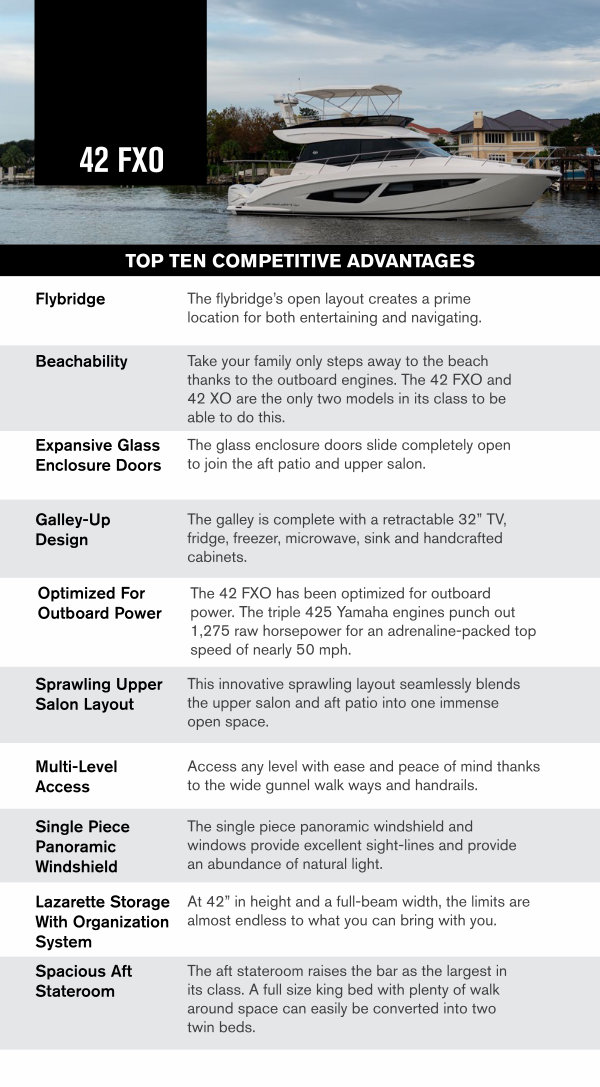 The 42 FXO has been optimized for outboard power. The triple 425 Yamaha engines punch out 1,275 raw horsepower for an adrenaline-packed top speed of nearly 50 mph.