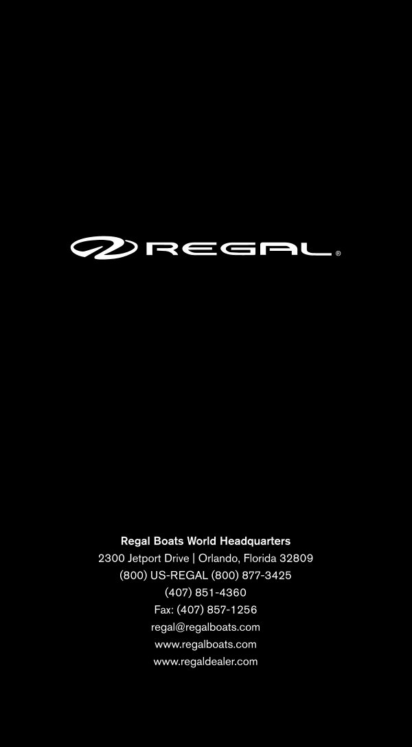 Regal Boats World Headquarters 2300 Jetport Drive | Orlando, Florida 32809( 800) US-REGAL( 800) 877-3425( 407) 851-4360 Fax:( 407) 857-1256 regal @ regalboats. com www. regalboats. com www. regaldealer. com