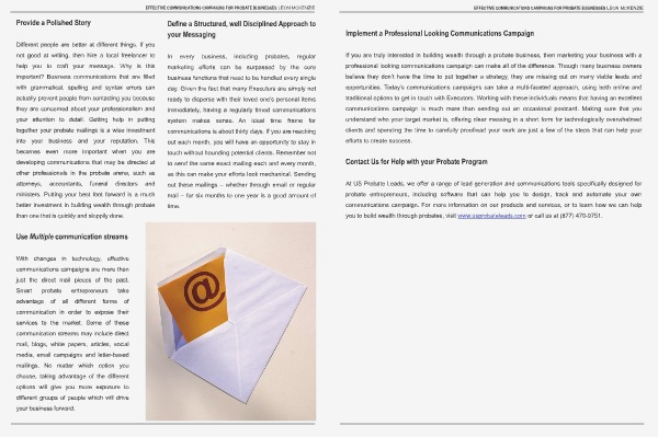 If you are truly interested in building wealth through a probate business, then marketing your business with a professional looking communications campaign can make all of the difference. Though many business owners believe they don’ t have the time to put together a strategy, they are missing out on many viable leads and opportunities. Today’ s communications campaigns can take a multifaceted approach, using both online and traditional options to get in touch with Executors. Working with these individuals means that having an excellent communications campaign is much more than sending out an occasional postcard. Making sure that you understand who your target market is, offering clear messing in a short form for technologically overwhelmed clients and spending the time to carefully proofread your work are just a few of the steps that can help your efforts to create success.
