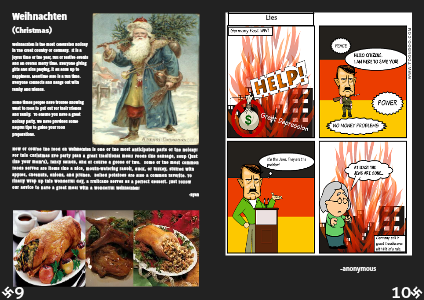 Now of course the food on Weihnachten is one of the most anticipated parts of the hoiday!For this Christmas Eve party plan a great traditional meal! Foods like sausage, soup (just like your mom's), fancy salads, and of course a goose or two. Some of the most common foods served are items like a nice, mouth-watering rabbit, duck, or turkey, stuffed with apples, chesnuts, onions, and prunes. Boiled potatoes are also a common favorite. To finally wrap up this wonderful day, a fruitcake serves as a perfect dessert. Just follow our advice to have a great meal with a wonderful Weihnachten!