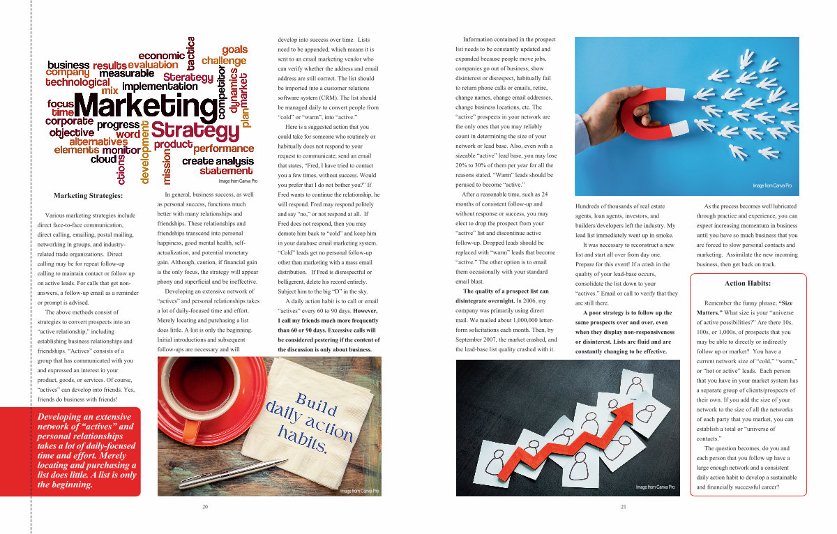 Remember the funny phrase;“ Size Matters.” What size is your“ universe of active possibilities?” Are there 10s, 100s, or 1,000s, of prospects that you may be able to directly or indirectly follow up or market? You have a current network size of“ cold,”“ warm,” or“ hot or active” leads. Each person that you have in your market system has a separate group of clients / prospects of their own. If you add the size of your network to the size of all the networks of each party that you market, you can establish a total or“ universe of contacts.”