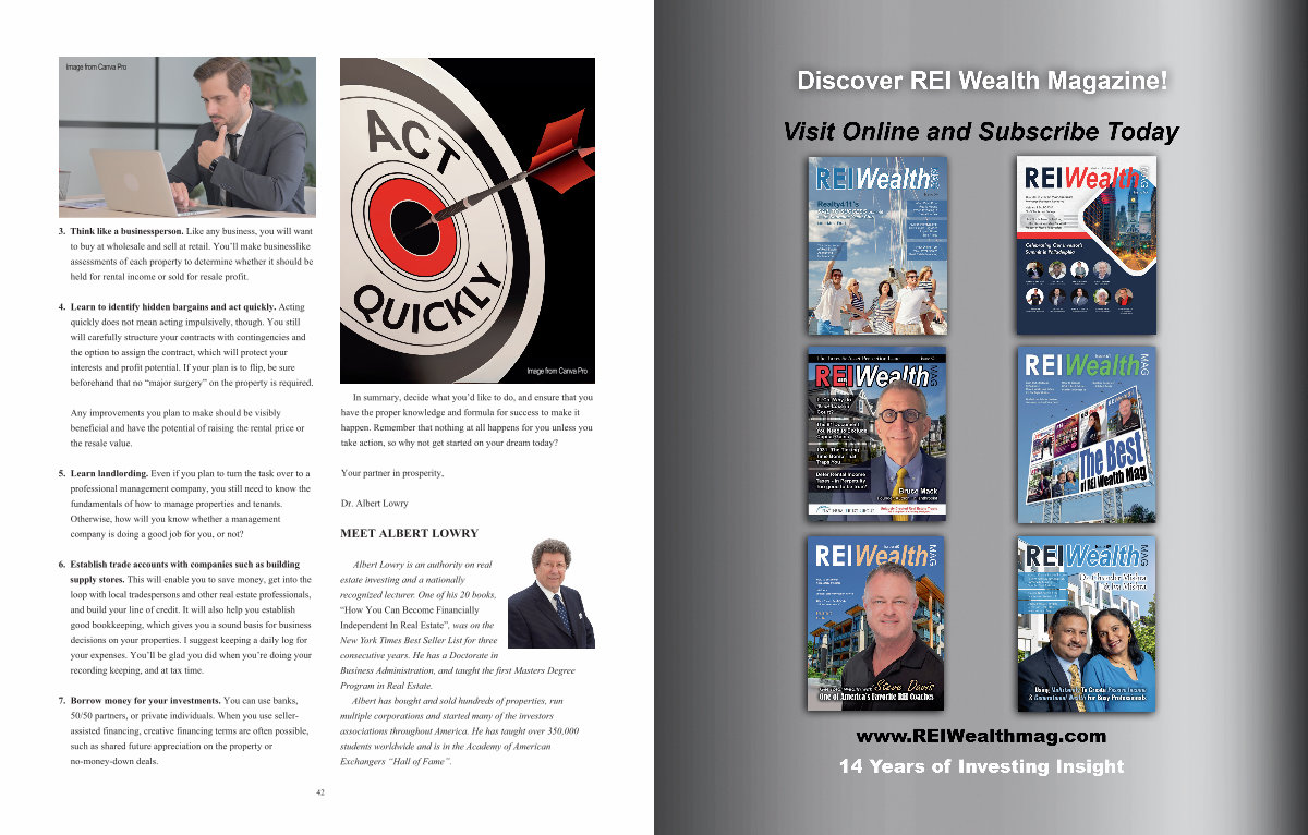 Albert Lowry is an authority on real estate investing and a nationally recognized lecturer. One of his 20 books,“ How You Can Become Financially Independent In Real Estate”, was on the New York Times Best Seller List for three consecutive years. He has a Doctorate in Business Administration, and taught the first Masters Degree Program in Real Estate.