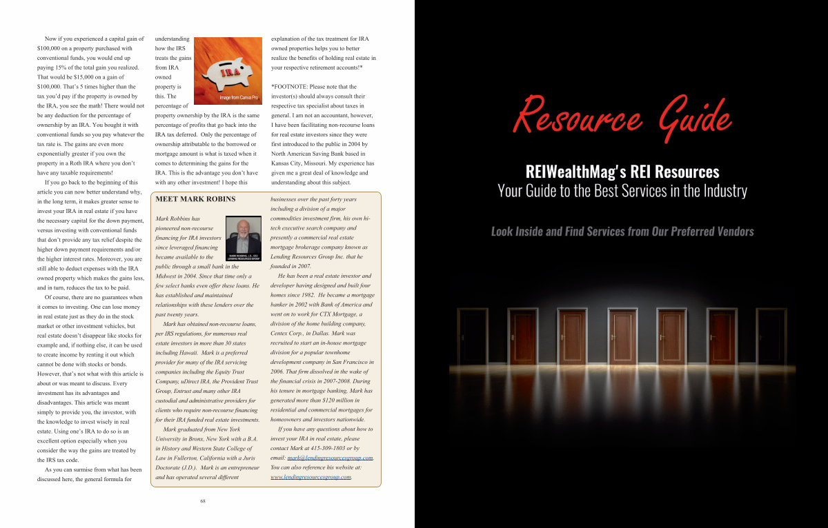 If you have any questions about how to invest your IRA in real estate, please contact Mark at 4153091803 or by email: mark @ lendingresourcesgroup. com. You can also reference his website at: www. lendingresourcesgroup. com.
