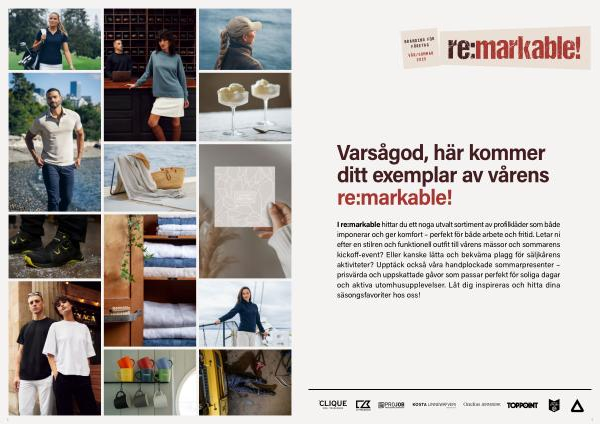 I re : markable hittar du ett noga utvalt sortiment av profilkläder som både imponerar och ger komfort – perfekt för både arbete och fritid . Letar ni efter en stilren och funktionell outfit till vårens mässor och sommarens kickoff-event ? Eller kanske lätta och bekväma plagg för säljkårens aktiviteter ? Upptäck också våra handplockade sommarpresenter – prisvärda och uppskattade gåvor som passar perfekt för soliga dagar och aktiva utomhusupplevelser . Låt dig inspireras och hitta dina säsongsfavoriter hos oss !