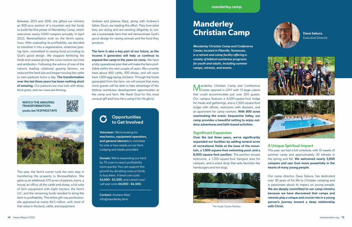 Between 2015 and 2016, she gifted our ministry an 800-acre portion of a mountain and the funds to build the first phase of Manderley Camp, which welcomes nearly 3,000 campers annually. In April 2022, RenewaNation took on the farm’ s operations. After evaluating its profitability, we decided to transition it into a regenerative, rotational grazing farm, committed to raising food according to God’ s good design. We stopped fertilizing the fields and ceased giving the cows routine vaccines and antibiotics. Following the advice of one of the nation’ s leading rotational grazing farmers, we reduced the herd size and began moving the cattle to new pastures twice a day. The transformation over the last three years has been nothing short of amazing. Our pastures are now lush with deep, thick grass, and our cows are thriving.