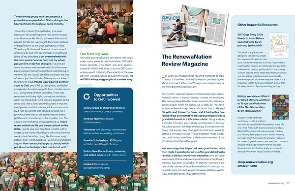Just one magazine impacted one grandfather, who then made it possible for all six of his grandchildren to receive a biblical worldview education. His personal investment of time and talent as a Christian school board member has been invaluable. In eternity, we’ ll learn the rest of the stories of how RenewaNation’ s ministry has helped young men and women develop a biblical worldview and significantly impact the world.