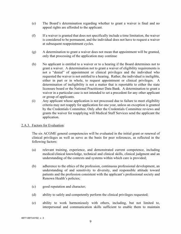 The six ACGME general competencies will be evaluated in the initial grant or renewal of clinical privileges as well as serve as the basis for peer references, as reflected in the following factors:
