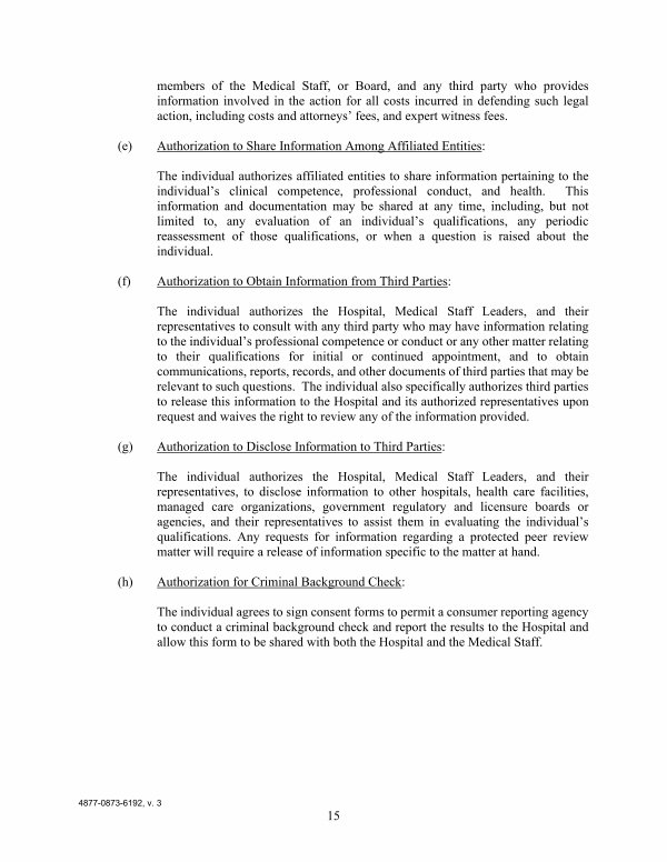 The individual authorizes the Hospital, Medical Staff Leaders, and their representatives to consult with any third party who may have information relating to the individual’ s professional competence or conduct or any other matter relating to their qualifications for initial or continued appointment, and to obtain communications, reports, records, and other documents of third parties that may be relevant to such questions. The individual also specifically authorizes third parties to release this information to the Hospital and its authorized representatives upon request and waives the right to review any of the information provided.