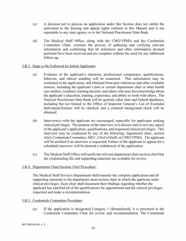 ( b) Interview( s) with the applicant are encouraged, especially for applicants seeking clinical privileges. The purpose of the interview is to discuss and review any aspect of the applicant’ s application, qualifications, and requested clinical privileges. This interview may be conducted by any of the following: department chair, section chief, Credentials Committee, MEC, Chief of Staff, or CMO / VPMA. The applicant will be notified if an interview is requested. Failure of the applicant to appear for a scheduled interview will be deemed a withdrawal of the application.