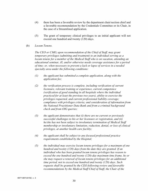 The CEO or CMO, upon recommendation of the Chief of Staff, may grant temporary privileges( admitting and treatment) to an individual serving as a locum tenens for a member of the Medical Staff who is on vacation, attending an educational seminar, ill, and / or otherwise needs coverage assistance for a period of time; or, when necessary to prevent a lack or lapse of services in a needed specialty area under the following conditions: