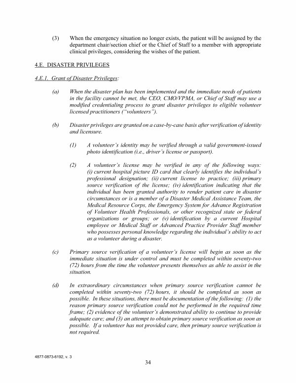 ( 2) A volunteer’ s license may be verified in any of the following ways:( i) current hospital picture ID card that clearly identifies the individual’ s professional designation;( ii) current license to practice;( iii) primary source verification of the license;( iv) identification indicating that the individual has been granted authority to render patient care in disaster circumstances or is a member of a Disaster Medical Assistance Team, the Medical Resource Corps, the Emergency System for Advance Registration of Volunteer Health Professionals, or other recognized state or federal organizations or groups; or( v) identification by a current Hospital employee or Medical Staff or Advanced Practice Provider Staff member who possesses personal knowledge regarding the individual’ s ability to act as a volunteer during a disaster.