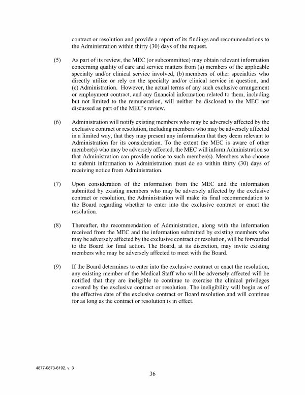 ( 5) As part of its review, the MEC( or subcommittee) may obtain relevant information concerning quality of care and service matters from( a) members of the applicable specialty and / or clinical service involved,( b) members of other specialties who directly utilize or rely on the specialty and / or clinical service in question, and( c) Administration. However, the actual terms of any such exclusive arrangement or employment contract, and any financial information related to them, including but not limited to the remuneration, will neither be disclosed to the MEC nor discussed as part of the MEC’ s review.