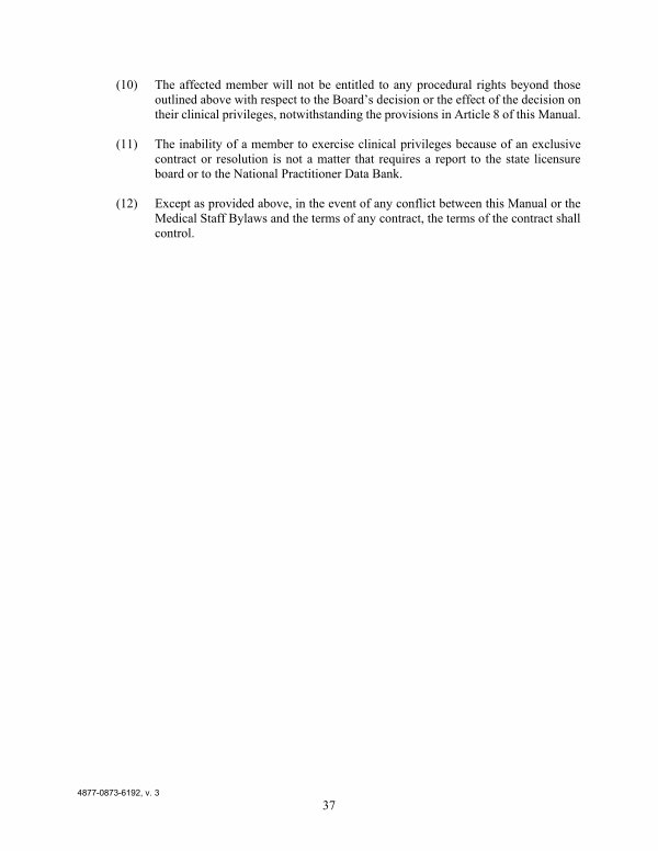 ( 10) The affected member will not be entitled to any procedural rights beyond those outlined above with respect to the Board’ s decision or the effect of the decision on their clinical privileges, notwithstanding the provisions in Article 8 of this Manual.