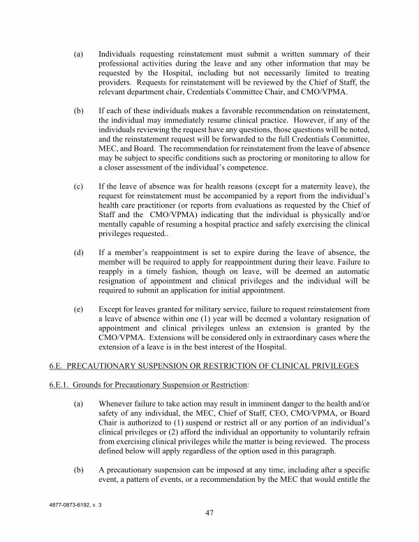 ( b) If each of these individuals makes a favorable recommendation on reinstatement, the individual may immediately resume clinical practice. However, if any of the individuals reviewing the request have any questions, those questions will be noted, and the reinstatement request will be forwarded to the full Credentials Committee, MEC, and Board. The recommendation for reinstatement from the leave of absence may be subject to specific conditions such as proctoring or monitoring to allow for a closer assessment of the individual’ s competence.