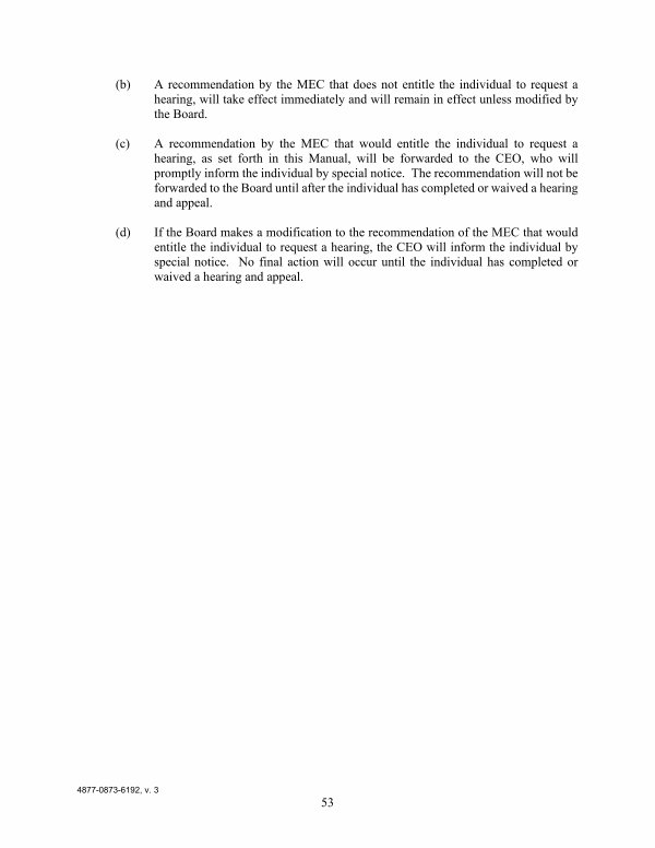 ( c) A recommendation by the MEC that would entitle the individual to request a hearing, as set forth in this Manual, will be forwarded to the CEO, who will promptly inform the individual by special notice. The recommendation will not be forwarded to the Board until after the individual has completed or waived a hearing and appeal.