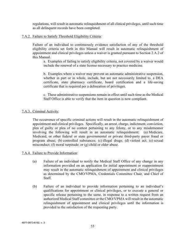 Failure of an individual to continuously evidence satisfaction of any of the threshold eligibility criteria set forth in this Manual will result in automatic relinquishment of appointment and clinical privileges unless a waiver is granted pursuant to Section 2. A. 2 of this Manual. a. Examples of failing to satisfy eligibility criteria, not covered by a waiver would include the renewal of a state license necessary to practice medicine.