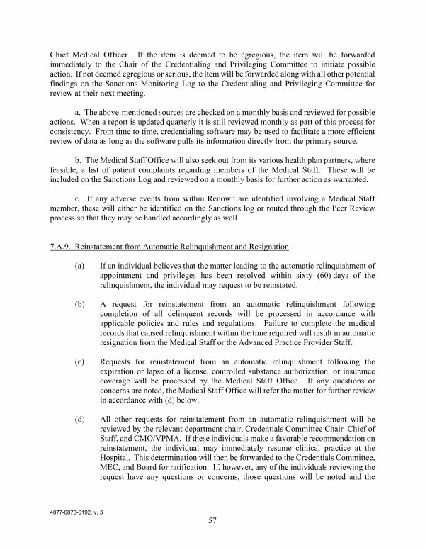 Chief Medical Officer. If the item is deemed to be egregious, the item will be forwarded immediately to the Chair of the Credentialing and Privileging Committee to initiate possible action. If not deemed egregious or serious, the item will be forwarded along with all other potential findings on the Sanctions Monitoring Log to the Credentialing and Privileging Committee for review at their next meeting.