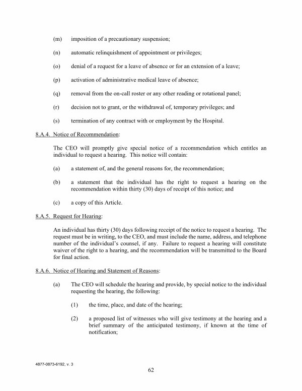 ( m) imposition of a precautionary suspension;( n) automatic relinquishment of appointment or privileges;( o) denial of a request for a leave of absence or for an extension of a leave;( p) activation of administrative medical leave of absence;( q) removal from the on-call roster or any other reading or rotational panel;( r) decision not to grant, or the withdrawal of, temporary privileges; and( s) termination of any contract with or employment by the Hospital.