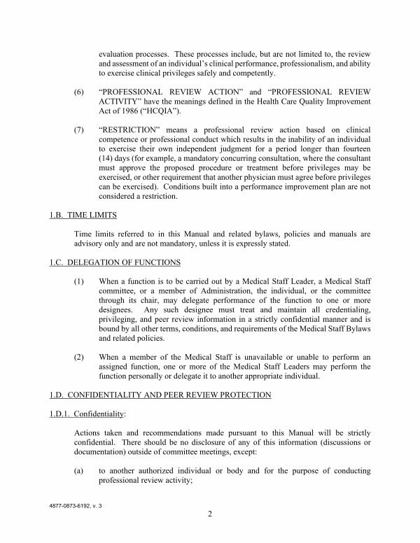 ( 1) When a function is to be carried out by a Medical Staff Leader, a Medical Staff committee, or a member of Administration, the individual, or the committee through its chair, may delegate performance of the function to one or more designees. Any such designee must treat and maintain all credentialing, privileging, and peer review information in a strictly confidential manner and is bound by all other terms, conditions, and requirements of the Medical Staff Bylaws and related policies.