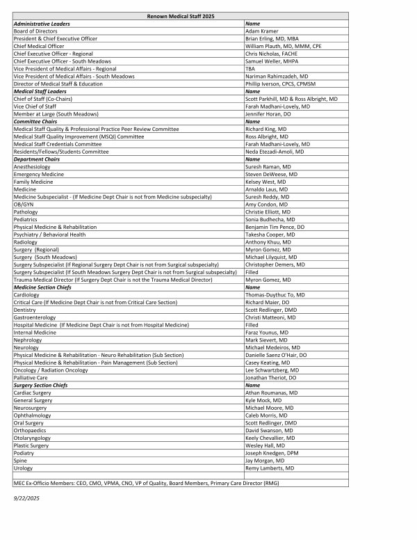 Administrative Leaders Board of Directors President & Chief Executive Officer Chief Medical Officer Chief Executive Officer- Regional Chief Executive Officer- South Meadows Vice President of Medical Affairs- Regional Vice President of Medical Affairs- South Meadows Director of Medical Staff & Education Medical Staff Leaders Chief of Staff( Co-Chairs) Vice Chief of Staff Member at Large( South Meadows) Committee Chairs Medical Staff Quality & Professional Practice Peer Review Committee Medical Staff Quality Improvement( MSQI) Committee Medical Staff Credentials Committee Residents / Fellows / Students Committee Department Chairs Anesthesiology Emergency Medicine Family Medicine Medicine Medicine Subspecialist-( If Medicine Dept Chair is not from Medicine subspecialty) OB / GYN Pathology Pediatrics Physical Medicine & Rehabilitation Psychiatry / Behavioral Health Radiology Surgery( Regional) Surgery( South Meadows) Surgery Subspecialist( If Regional Surgery Dept Chair is not from Surgical subspecialty) Surgery Subspecialist( If South Meadows Surgery Dept Chair is not from Surgical subspecialty) Trauma Medical Director( If Surgery Dept Chair is not the Trauma Medical Director) Medicine Section Chiefs Cardiology Critical Care( If Medicine Dept Chair is not from Critical Care Section) Dentistry Gastroenterology Hospital Medicine( If Medicine Dept Chair is not from Hospital Medicine) Internal Medicine Nephrology Neurology Physical Medicine & Rehabilitation- Neuro Rehabilitation( Sub Section) Physical Medicine & Rehabilitation- Pain Management( Sub Section) Oncology / Radiation Oncology Palliative Care Surgery Section Chiefs Cardiac Surgery General Surgery Neurosurgery Ophthalmology Oral Surgery Orthopaedics Otolaryngology Plastic Surgery Podiatry Spine Urology