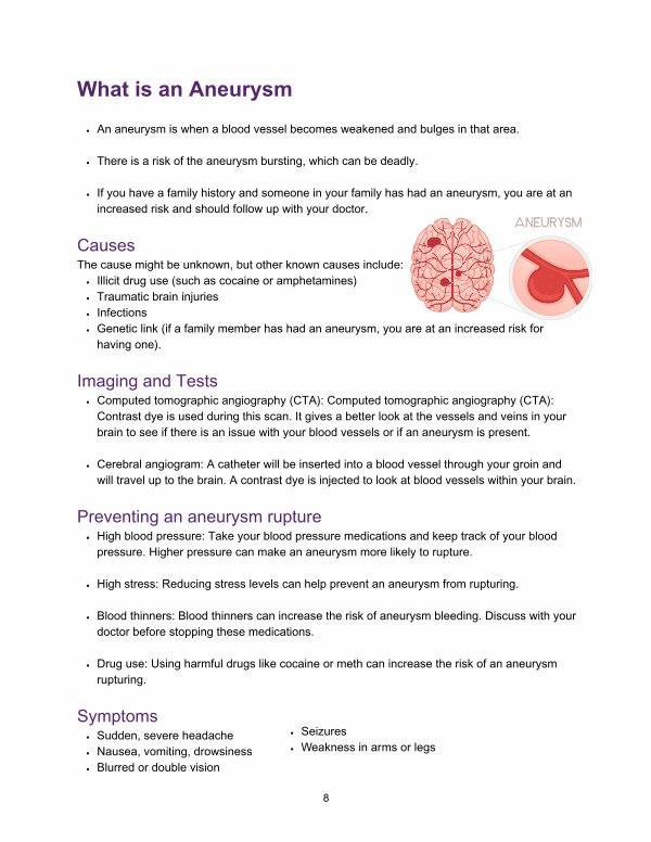 High blood pressure: Take your blood pressure medications and keep track of your blood pressure. Higher pressure can make an aneurysm more likely to rupture.