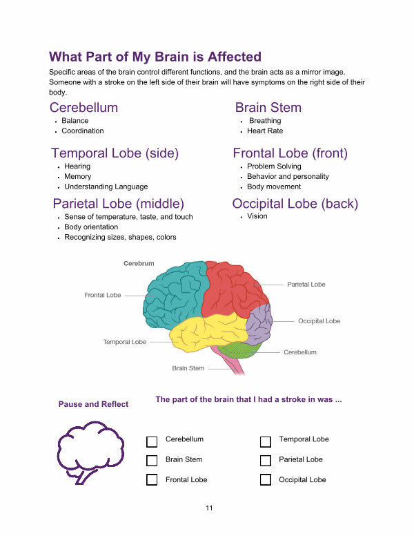 Specific areas of the brain control different functions, and the brain acts as a mirror image. Someone with a stroke on the left side of their brain will have symptoms on the right side of their body.