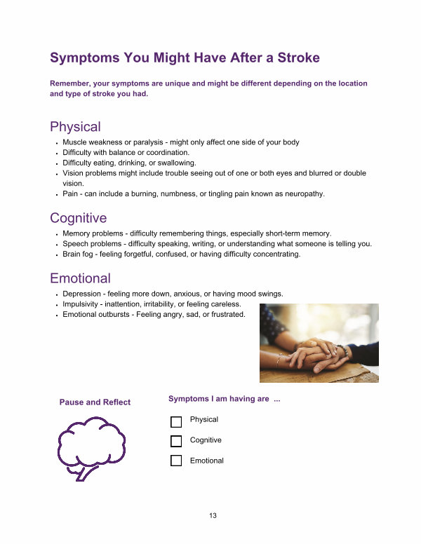 Remember, your symptoms are unique and might be different depending on the location and type of stroke you had.