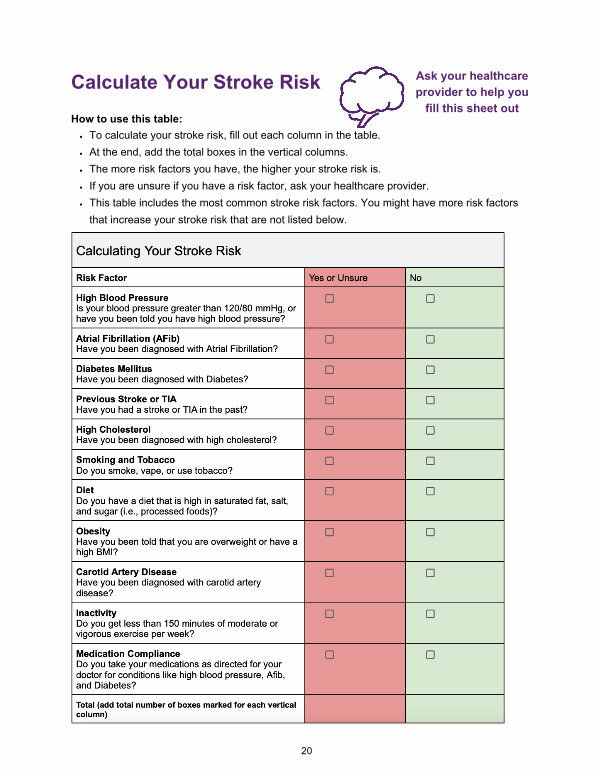 How to use this table: To calculate your stroke risk, fill out each column in the table. At the end, add the total boxes in the vertical columns. The more risk factors you have, the higher your stroke risk is. If you are unsure if you have a risk factor, ask your healthcare provider. This table includes the most common stroke risk factors. You might have more risk factors that increase your stroke risk that are not listed below.