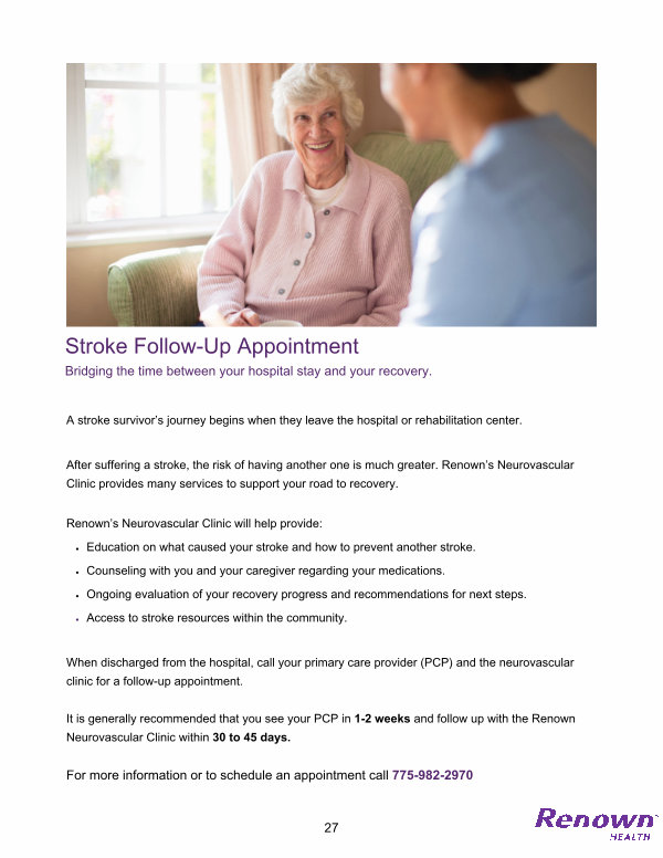 Renown’ s Neurovascular Clinic will help provide: Education on what caused your stroke and how to prevent another stroke. Counseling with you and your caregiver regarding your medications. Ongoing evaluation of your recovery progress and recommendations for next steps. Access to stroke resources within the community.