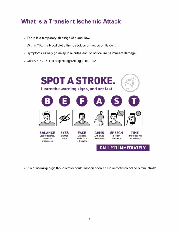 There is a temporary blockage of blood flow. With a TIA, the blood clot either dissolves or moves on its own. Symptoms usually go away in minutes and do not cause permanent damage. Use B. E. F. A. S. T to help recognize signs of a TIA.
