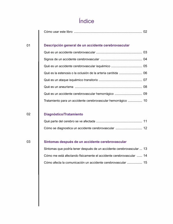 Descripción general de un accidente cerebrovascular Qué es un accidente cerebrovascular.................................................... 03 Signos de un accidente cerebrovascular............................................... 04 Qué es un accidente cerebrovascular isquémico................................... 05 Qué es la estenosis o la oclusión de la arteria carótida.......................... 06 Qué es un ataque isquémico transitorio................................................. 07 Qué es un aneurisma............................................................................ 08 Qué es un accidente cerebrovascular hemorrágico............................... 09 Tratamiento para un accidente cerebrovascular hemorrágico................ 10
