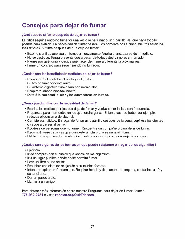 Para obtener más información sobre nuestro Programa para dejar de fumar, llame al 775-982-2781 o visite renown. org / QuitTobacco.