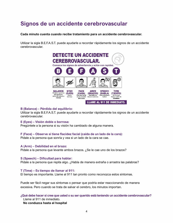 T( Time) – Es tiempo de llamar al 911: El tiempo es importante. Llame al 911 tan pronto como reconozca estos síntomas.
