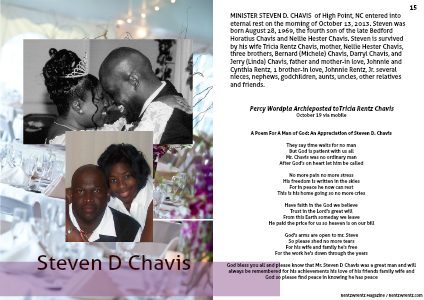 MINISTER STEVEN D. CHAVIS of High Point, NC entered into eternal rest on the morning of October 13, 2013. Steven was born August 28, 1969, the fourth son of the late Bedford Horatius Chavis and Nellie Hester Chavis. Steven is survived by his wife Tricia Rentz Chavis, mother, Nellie Hester Chavis, three brothers, Bernard (Michele) Chavis, Darryl Chavis, and Jerry (Linda) Chavis, father and mother-in love, Johnnie and Cynthia Rentz, 1 brother-in love, Johnnie Rentz, Jr. several nieces, nephews, godchildren, aunts, uncles, other relatives and friends.