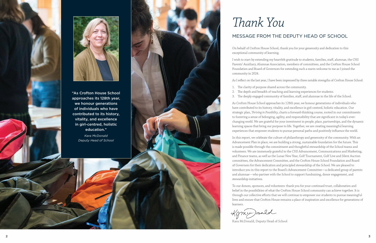 On behalf of Crofton House School, thank you for your generosity and dedication to this exceptional community of learning.