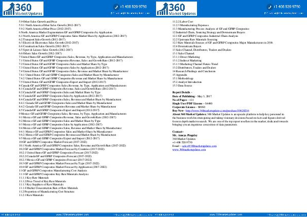 5.9 Other Sales Growth and Price 5.9.1 North America Other Sales Growth( 2012-2017) 5.9.2 North America Other Price( 2012-2017) 6 North America Market Segmentation GF and GFRP Composites by Application 6.1 North America GF and GFRP Composites Sales Market Share by Application( 2012-2017) 6.2 Transport Sales Growth( 2012-2017) 6.3 Electro & Electronics Sales Growth( 2012-2017) 6.4 Construction Sales Growth( 2012-2017) 6.5 Sport & Leisure Sales Growth( 2012-2017) 6.6 Others Sales Growth( 2012-2017) 7 United States GF and GFRP Composites Sales, Revenue, by Type, Application and Manufacturers 7.1 United States GF and GFRP Composites Revenue, Sales and Growth Rate( 2012-2017) 7.2 United States GF and GFRP Composites Sales and Market Share by Type 7.3 United States GF and GFRP Composites Sales by Application( 2012-2017) 7.4 United States GF and GFRP Composites Sales, Revenue and Market Share by Manufacturer 7.4.1 United States GF and GFRP Composites Sales and Market Share by Manufacturer 7.4.2 United States GF and GFRP Composites Revenue and Market Share by Manufacturer 7.5 United States GF and GFRP Composites Export and Import( 2012-2017) 8 Canada GF and GFRP Composites Sales, Revenue, by Type, Application and Manufacturers 8.1 Canada GF and GFRP Composites Revenue, Sales and Growth Rate( 2012-2017) 8.2 Canada GF and GFRP Composites Sales and Market Share by Type 8.3 Canada GF and GFRP Composites Sales by Application( 2012-2017) 8.4 Canada GF and GFRP Composites Sales, Revenue and Market Share by Manufacturer 8.4.1 Canada GF and GFRP Composites Sales and Market Share by Manufacturer 8.4.2 Canada GF and GFRP Composites Revenue and Market Share by Manufacturer 8.5 Canada GF and GFRP Composites Export and Import( 2012-2017) 9 Mexico GF and GFRP Composites Sales, Revenue, by Type, Application and Manufacturers 9.1 Mexico GF and GFRP Composites Revenue, Sales and Growth Rate( 2012-2017) 9.2 Mexico GF and GFRP Composites Sales and Market Share by Type 9.3 Mexico GF and GFRP Composites Sales by Application( 2012-2017) 9.4 Mexico GF and GFRP Composites Sales, Revenue and Market Share by Manufacturer 9.4.1 Mexico GF and GFRP Composites Sales and Market Share by Manufacturer 9.4.2 Mexico GF and GFRP Composites Revenue and Market Share by Manufacturer 9.5 Mexico GF and GFRP Composites Export and Import( 2012-2017) 10 GF and GFRP Composites Market Forecast( 2017-2022) 10.1 North America GF and GFRP Composites Sales, Revenue and Growth Rate( 2017-2022) 10.2 GF and GFRP Composites Market Forecast by Countries( 2017-2022) 10.2.1 United States GF and GFRP Composites Forecast( 2017-2022) 10.2.2 Canada GF and GFRP Composites Forecast( 2017-2022) 10.2.3 Mexico GF and GFRP Composites Forecast( 2017-2022) 10.3 GF and GFRP Composites Market Forecast by Type( 2017-2022) 10.4 GF and GFRP Composites Market Forecast by Application( 2017-2022) 11 GF and GFRP Composites Manufacturing Cost Analysis 11.1 GF and GFRP Composites Key Raw Materials Analysis 11.1.1 Key Raw Materials 11.1.2 Price Trend of Key Raw Materials 11.1.3 Key Suppliers of Raw Materials 11.1.4 Market Concentration Rate of Raw Materials 11.2 Proportion of Manufacturing Cost Structure 11.2.1 Raw Materials