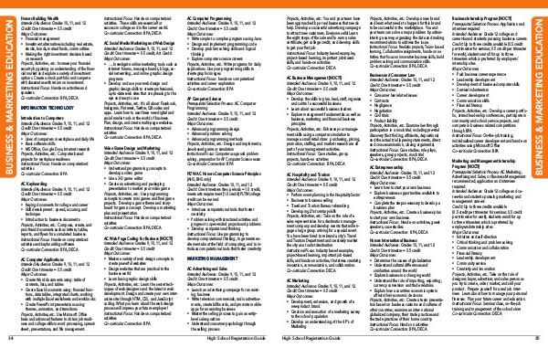 Projects, Activities, etc.: Create a business plan to start your own business. Instructional Focus: Hands-on activities, guest speakers, case studies Co-curricular Connection: BPA, DECA