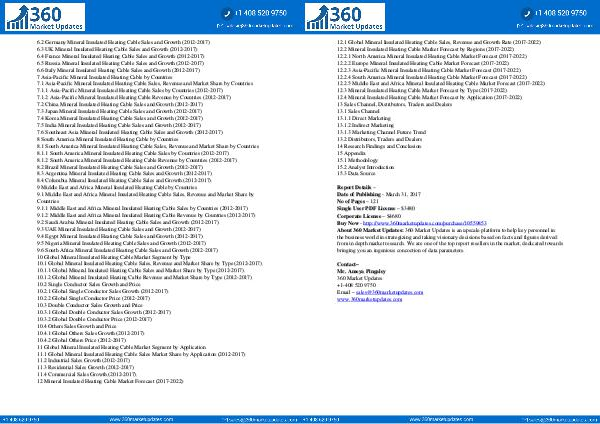 6.2 Germany Mineral Insulated Heating Cable Sales and Growth( 2012-2017) 6.3 UK Mineral Insulated Heating Cable Sales and Growth( 2012-2017) 6.4 France Mineral Insulated Heating Cable Sales and Growth( 2012-2017) 6.5 Russia Mineral Insulated Heating Cable Sales and Growth( 2012-2017) 6.6 Italy Mineral Insulated Heating Cable Sales and Growth( 2012-2017) 7 Asia-Pacific Mineral Insulated Heating Cable by Countries 7.1 Asia-Pacific Mineral Insulated Heating Cable Sales, Revenue and Market Share by Countries 7.1.1 Asia-Pacific Mineral Insulated Heating Cable Sales by Countries( 2012-2017) 7.1.2 Asia-Pacific Mineral Insulated Heating Cable Revenue by Countries( 2012-2017) 7.2 China Mineral Insulated Heating Cable Sales and Growth( 2012-2017) 7.3 Japan Mineral Insulated Heating Cable Sales and Growth( 2012-2017) 7.4 Korea Mineral Insulated Heating Cable Sales and Growth( 2012-2017) 7.5 India Mineral Insulated Heating Cable Sales and Growth( 2012-2017) 7.6 Southeast Asia Mineral Insulated Heating Cable Sales and Growth( 2012-2017) 8 South America Mineral Insulated Heating Cable by Countries 8.1 South America Mineral Insulated Heating Cable Sales, Revenue and Market Share by Countries 8.1.1 South America Mineral Insulated Heating Cable Sales by Countries( 2012-2017) 8.1.2 South America Mineral Insulated Heating Cable Revenue by Countries( 2012-2017) 8.2 Brazil Mineral Insulated Heating Cable Sales and Growth( 2012-2017) 8.3 Argentina Mineral Insulated Heating Cable Sales and Growth( 2012-2017) 8.4 Columbia Mineral Insulated Heating Cable Sales and Growth( 2012-2017) 9 Middle East and Africa Mineral Insulated Heating Cable by Countries 9.1 Middle East and Africa Mineral Insulated Heating Cable Sales, Revenue and Market Share by Countries 9.1.1 Middle East and Africa Mineral Insulated Heating Cable Sales by Countries( 2012-2017) 9.1.2 Middle East and Africa Mineral Insulated Heating Cable Revenue by Countries( 2012-2017) 9.2 Saudi Arabia Mineral Insulated Heating Cable Sales and Growth( 2012-2017) 9.3 UAE Mineral Insulated Heating Cable Sales and Growth( 2012-2017) 9.4 Egypt Mineral Insulated Heating Cable Sales and Growth( 2012-2017) 9.5 Nigeria Mineral Insulated Heating Cable Sales and Growth( 2012-2017) 9.6 South Africa Mineral Insulated Heating Cable Sales and Growth( 2012-2017) 10 Global Mineral Insulated Heating Cable Market Segment by Type 10.1 Global Mineral Insulated Heating Cable Sales, Revenue and Market Share by Type( 2012-2017) 10.1.1 Global Mineral Insulated Heating Cable Sales and Market Share by Type( 2012-2017) 10.1.2 Global Mineral Insulated Heating Cable Revenue and Market Share by Type( 2012-2017) 10.2 Single Conductor Sales Growth and Price 10.2.1 Global Single Conductor Sales Growth( 2012-2017) 10.2.2 Global Single Conductor Price( 2012-2017) 10.3 Double Conductor Sales Growth and Price 10.3.1 Global Double Conductor Sales Growth( 2012-2017) 10.3.2 Global Double Conductor Price( 2012-2017) 10.4 Others Sales Growth and Price 10.4.1 Global Others Sales Growth( 2012-2017) 10.4.2 Global Others Price( 2012-2017) 11 Global Mineral Insulated Heating Cable Market Segment by Application 11.1 Global Mineral Insulated Heating Cable Sales Market Share by Application( 2012-2017) 11.2 Industrial Sales Growth( 2012-2017) 11.3 Residential Sales Growth( 2012-2017) 11.4 Commercial Sales Growth( 2012-2017) 12 Mineral Insulated Heating Cable Market Forecast( 2017-2022)