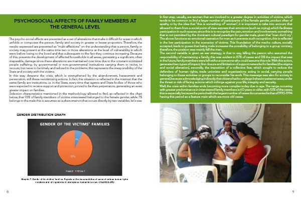 The psycho-social effects are presented as a set of alterations that make it difficult for areas in which unfolds or composes the person, family and society in greater or lesser proportion. Therefore, the results expressed are presented as "multi-affections" on the understanding that a person, family or society may present at the same time two or more alterations at the level of vulnerability in which were before losing to the loved and that subsequent to the fact they continue increasing. Because of this, prevents the development of affected households in all areas, generating a significant, often irreparable, damage since these alterations are maintained over time due to the constant victimized people suffering; by governmental or non-governmental institutions carrying them to revive, to recount, but never to be timely and tailored to the problems, this represents the irresponsibility of the State and society with the victims.