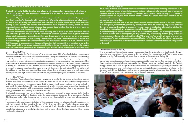67% of people who took part in the documented cases have unresolved grief or for some cases a duel ambiguous, demonstrating chronicity of symptoms, while the remaining 33 per cent identified the way of coping with the fact in two ways; First, by means of legal action allowing them to feel the possibility of finding the truth and justice, second, through religious beliefs.