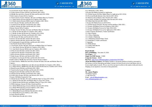 4.4 Asia-Pacific Sesame Oil Sales and Growth( 2011-2016) 4.5 South America Sesame Oil Sales and Growth( 2011-2016) 4.6 Middle East and Africa Sesame Oil Sales and Growth( 2011-2016) 5 North America Sesame Oil by Countries 5.1 North America Sesame Oil Sales, Revenue and Market Share by Countries 5.1.1 North America Sesame Oil Sales by Countries( 2011-2016) 5.1.2 North America Sesame Oil Revenue by Countries( 2011-2016) 5.2 USA Sesame Oil Sales and Growth( 2011-2016) 5.3 Canada Sesame Oil Sales and Growth( 2011-2016) 5.4 Mexico Sesame Oil Sales and Growth( 2011-2016) 6 Europe Sesame Oil by Countries 6.1 Europe Sesame Oil Sales, Revenue and Market Share by Countries 6.1.1 Europe Sesame Oil Sales by Countries( 2011-2016) 6.1.2 Europe Sesame Oil Revenue by Countries( 2011-2016) 6.2 Germany Sesame Oil Sales and Growth( 2011-2016) 6.3 UK Sesame Oil Sales and Growth( 2011-2016) 6.4 France Sesame Oil Sales and Growth( 2011-2016) 6.5 Russia Sesame Oil Sales and Growth( 2011-2016) 6.6 Technologyaly Sesame Oil Sales and Growth( 2011-2016) 7 Asia-Pacific Sesame Oil by Countries 7.1 Asia-Pacific Sesame Oil Sales, Revenue and Market Share by Countries 7.1.1 Asia-Pacific Sesame Oil Sales by Countries( 2011-2016) 7.1.2 Asia-Pacific Sesame Oil Revenue by Countries( 2011-2016) 7.2 China Sesame Oil Sales and Growth( 2011-2016) 7.3 Japan Sesame Oil Sales and Growth( 2011-2016) 7.4 Korea Sesame Oil Sales and Growth( 2011-2016) 7.5 India Sesame Oil Sales and Growth( 2011-2016) 7.6 Southeast Asia Sesame Oil Sales and Growth( 2011-2016) 8 South America, Middle East and Africa Sesame Oil by Countries 8.1 South America, Middle East and Africa Sesame Oil Sales, Revenue and Market Share by Countries 8.1.1 South America, Middle East and Africa Sesame Oil Sales by Countries( 2011-2016) 8.1.2 South America, Middle East and Africa Sesame Oil Revenue by Countries( 2011-2016) 8.2 Brazil Sesame Oil Sales and Growth( 2011-2016) 8.3 Saudi Arabia Sesame Oil Sales and Growth( 2011-2016) 8.4 Egypt Sesame Oil Sales and Growth( 2011-2016) 8.5 Nigeria Sesame Oil Sales and Growth( 2011-2016) 8.6 South Africa Sesame Oil Sales and Growth( 2011-2016) 9 Sesame Oil Market Segment by Type 9.1 Global Sesame Oil Sales, Revenue and Market Share by Type( 2011-2016) 9.1.1 Global Sesame Oil Sales and Market Share by Type( 2011-2016) 9.1.2 Global Sesame Oil Revenue and Market Share by Type( 2011-2016) 9.2 WhTechnologye Sesame Oil Sales Growth and Price 9.2.1 Global WhTechnologye Sesame Oil Sales Growth( 2011-2016) 9.2.2 Global WhTechnologye Sesame Oil Price( 2011-2016) 9.3 Black Sesame Oil Sales Growth and Price 9.3.1 Global Black Sesame Oil Sales Growth( 2011-2016) 9.3.2 Global Black Sesame Oil Price( 2011-2016) 9.4 Sales Growth and Price 9.4.1 Global Sales Growth( 2011-2016)