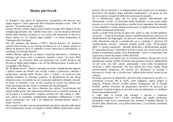 gioioso. Qui la selezione e la manipolazione sono un processo tecnologico preventivo che produce degli individui condizionati a tal punto da non essere neanche consapevoli della loro mancanza di umanità. Se ci chiedessimo, oggi, chi ha avuto ragione, individuando più chiaramente i rischi e le tentazioni della modernità, ovvero quale utopia negativa si sia rivelata più profetica, sarebbe facile rispondere che entrambi si sono sbagliati: la nostra attuale società non è né quella temuta da Orwell, né quella immaginata da Huxley! Anche se molte delle trovate di questi due autori si sono rivelate piuttosto azzeccate … Come la Neolingua, questo controllo del pensiero attraverso la manipolazione del linguaggio, un processo ormai decisamente affermato nelle allocuzioni ridicole o paradossali cui ci costringe l’ ipocrisia del“ politicamente corretto” coniando termini gentili come“ diversamente abile” o“ guerra umanitaria”. Quando politicanti e disinformatori parlano di“ operazioni di pace” riferendosi ai nostri eserciti che vanno in giro per il mondo a bombardare inermi civili fomentando l’ odio e il terrorismo, non si può fare a meno di pensare ai libri di Orwell. Ma pure Huxley, per molti versi, si è rivelato profetico. Ha previsto che la riproduzione umana sarebbe diventata una questione tecnica, indipendente sia dal sesso che dall’ amore, anticipando i temi della fecondazione artificiale e della clonazione. Per non parlare del soma, quella droga generosamente dispensata dal sistema per allontanare le tensioni e prevenire le rivolte, che ci ricorda certe“ pillole della felicità” ormai di uso comune. Insomma, qualcosa di inquietante, previsto dalla fantascienza sociale, si è certamente avverato. Ma la realtà, come sappiamo, supera sempre la fantasia. Neanche Orwell avrebbe potuto immaginare che Il Grande Fratello sarebbe diventato un programma televisivo di successo per partecipare al quale migliaia di giovani coatti ed esibizionisti si sarebbero battuti spasmodicamente!!! A conti fatti, la società del duemila è riuscita a realizzare contemporaneamente sia l’ incubo orwelliano che quello huxleyano. Integrando, come aveva commentato Guy Debord, il modello liberale, la Società dello Spettacolo, con quello burocratico, il socialismo realmente dittatoriale.