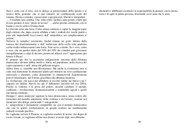 Non è certo con il voto, con la delega ai professionisti della parola o ai tecnici della gestione, che si può ottenere un cambiamento reale del sistema. Destra o sinistra, conservatori o progressisti, liberali o integralisti … il risultato non cambia. Una volta eletti i politici sono pronti a tutto pur di non perdere il loro“ posto di lavoro” … anche perché, altrimenti, con le buone o con le cattive li fanno fuori Le elezioni sono una farsa. Come ormai comincia a capire la maggior parte degli elettori che, dopo essersi affidata a tutti i simboli dei vecchi partiti e pure alle improbabili facce nuove dell’ antipolitica, ora semplicemente si astiene. Tuttavia la semplice astensione, finché rimane un gesto dettato dalla nausea, dal disorientamento o dall’ imbarazzo della scelta( che qualsiasi scelta risulta imbarazzante) non basta. Non serve a niente. Se è vero, come è vero, che un partito eletto dal 30 % del 50 % dei cittadini può governare tranquillamente a colpi di decreto, pronto ad allearsi con l’ opposizione per fottere il Paese! E’ proprio qui che la sacrosanta indignazione suscitata dalla dittatura democratica diventa rabbia sterile e sfocia nel populismo, nella ricerca del capro espiatorio o nell’ attesa del pifferaio magico. Allora forse ci vorrebbe una Rivoluzione. Ma anche le rivoluzioni non si sono mai dimostrate lo strumento adatto per ottenere un vero cambiamento universale e duraturo, come dimostrano le innumerevoli degenerazioni post-rivoluzionarie, dal Terrore giacobino alla dittatura leninista. La rivoluzione, che nasce per abbattere il vecchio ordine ma finisce con l’ imporre un Ordine Nuovo, ha già il fallimento inscritto nel suo DNA. Poiché la violenza e la presa del potere, anziché cambiare il mondo, cambiano i rivoluzionari, disumanizzandoli e rendendoli uguali a quelli che hanno sostituito. Dunque l’ unico modo per superare la farsa democratica, senza cedere alle tentazioni del metodo autoritario, della violenza e del terrore, consiste nel rinunciare alla delega, praticando l’ autogestione. L’ autogestione è pienamente compatibile sia con il metodo democratico che con lo spirito rivoluzionario, in quanto realizza un cambiamento radicale in modo pacifico. Se vogliamo salvare il Pianeta, se vogliamo rendere le nostre vite degne di essere vissute, se vogliamo offrire una chance ai nostri figli, non abbiamo
