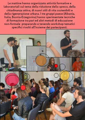 Le mattine hanno organizzato attività formative e laboratoriali sul tema della riduzione dello spreco, della cittadinanza attiva, di nuovi stili di vita sostenibili e della rigenerazione urbana. I tre gruppi paese (Albania, Italia, Bosnia-Erzegovina) hanno sperimentate tecniche di formazione tra pari ed altri metodi di educazione non-formale preparando e tenendo workshop tematici specifici rivolti all'insieme dei partecipanti.