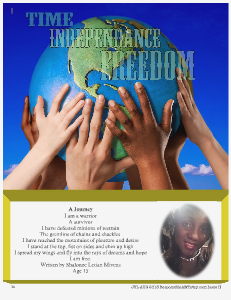 A Journey I am a warrior A survivor I have defeated minions of restrain The gremlins of chains and shackles I have reached the mountains of pleasure and desire I stand at the top, fist on sides and chin up high I spread my wings and fly into the rays of dreams and hope I am free. Written by Shalonze Letian Mivens Age 15
