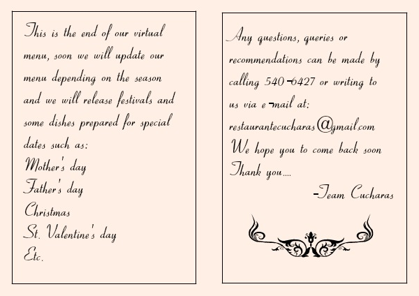 This is the end of our virtual menu, soon we will update our menu depending on the season and we will release festivals and some dishes prepared for special dates such as: